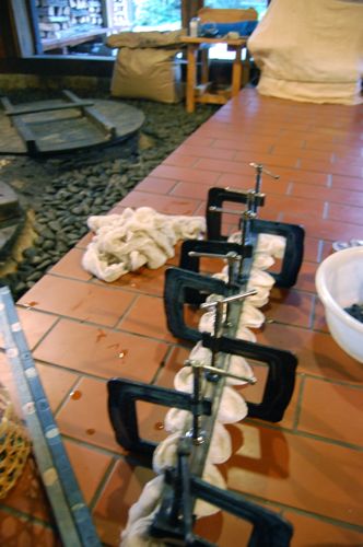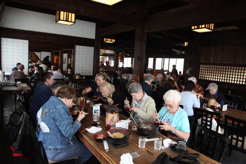 So, back on the bus and we were off to a lunch stop that had been planned at a famous country style udon house on the way to see the indigo dyer Satou Aiko san. This was a type of udon I had never had and apparently a regional dish in this area- called hotou. It included many vegetables and had a squash stew sort of flavor. We all loved it! Brenda and I had no problem polishing ours off and Kathy at the end of the table kept one all to herself- I think it might of been her favorite meal!