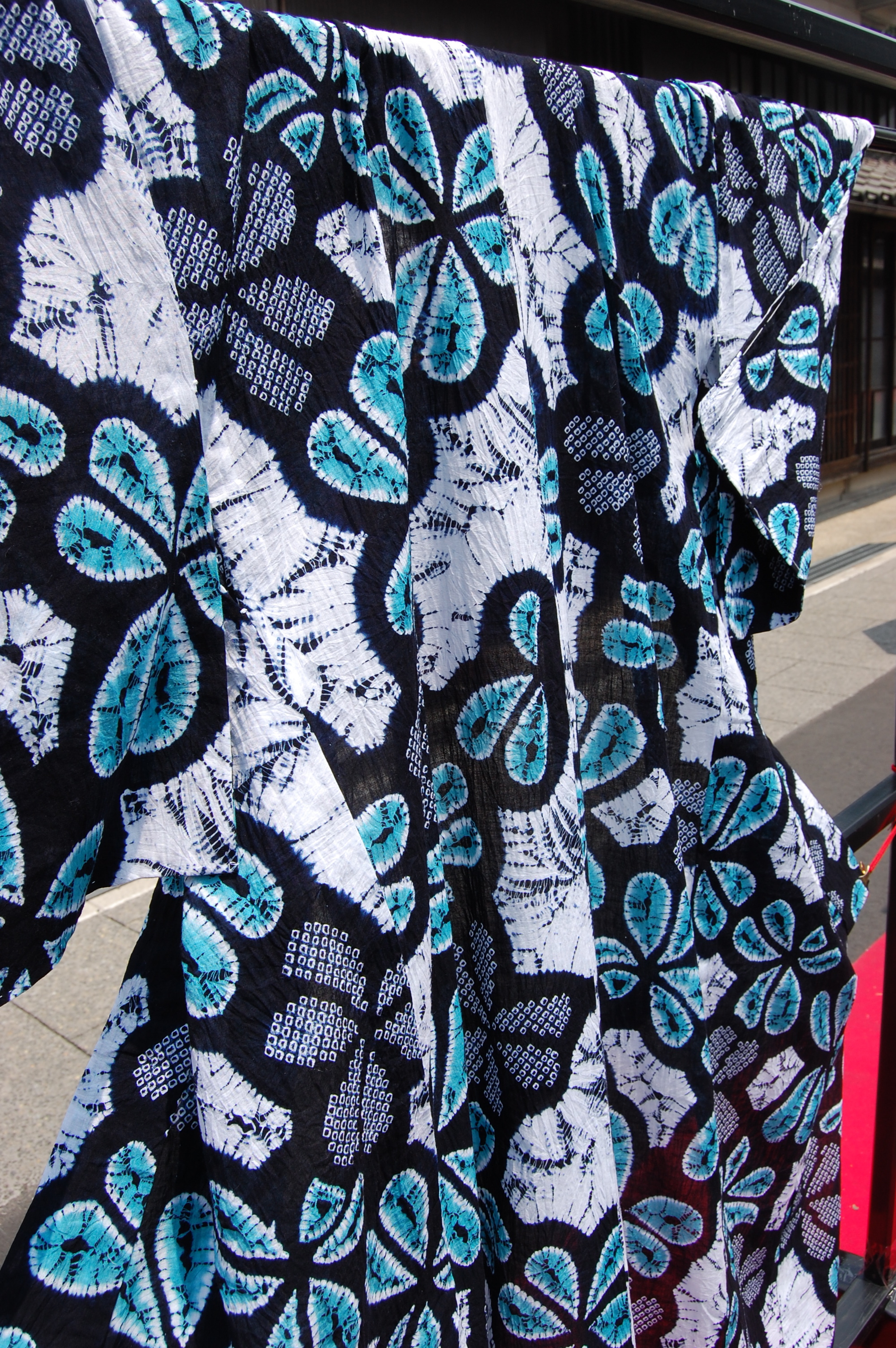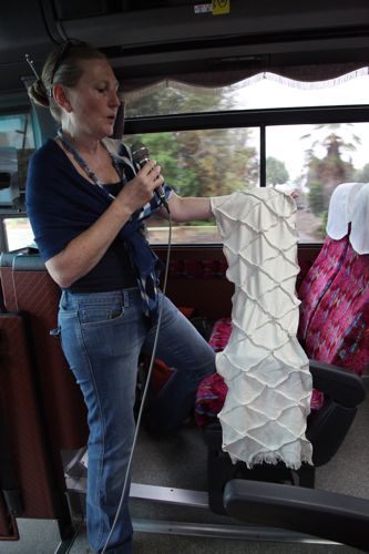 So, back on the bus again and I was finishing the last details of my assignment from indigo dyer Satou Aiko san to prepare a piece to dip into the indigo. With a large group such as ours and a limited amount of time there was only time for a speeded up demonstration of the process. I prepared a silk scarf using makinui and makiage techniques and before pulling up the stitches I briefly explained the technique to my fellow travelers-