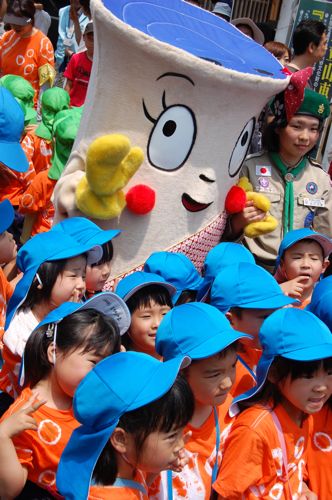 the Japanese really do like to create animated characters for special occasions. in marketing, cute is king and shibori chan was darned cute! he/she is a towel- like in the hot ones you get to wipe your hands with before you eat. and those kids in their orange shibori t’s and blue hats…adorable! the silk industry in Gunma has created shiruky chan(silky chan)
